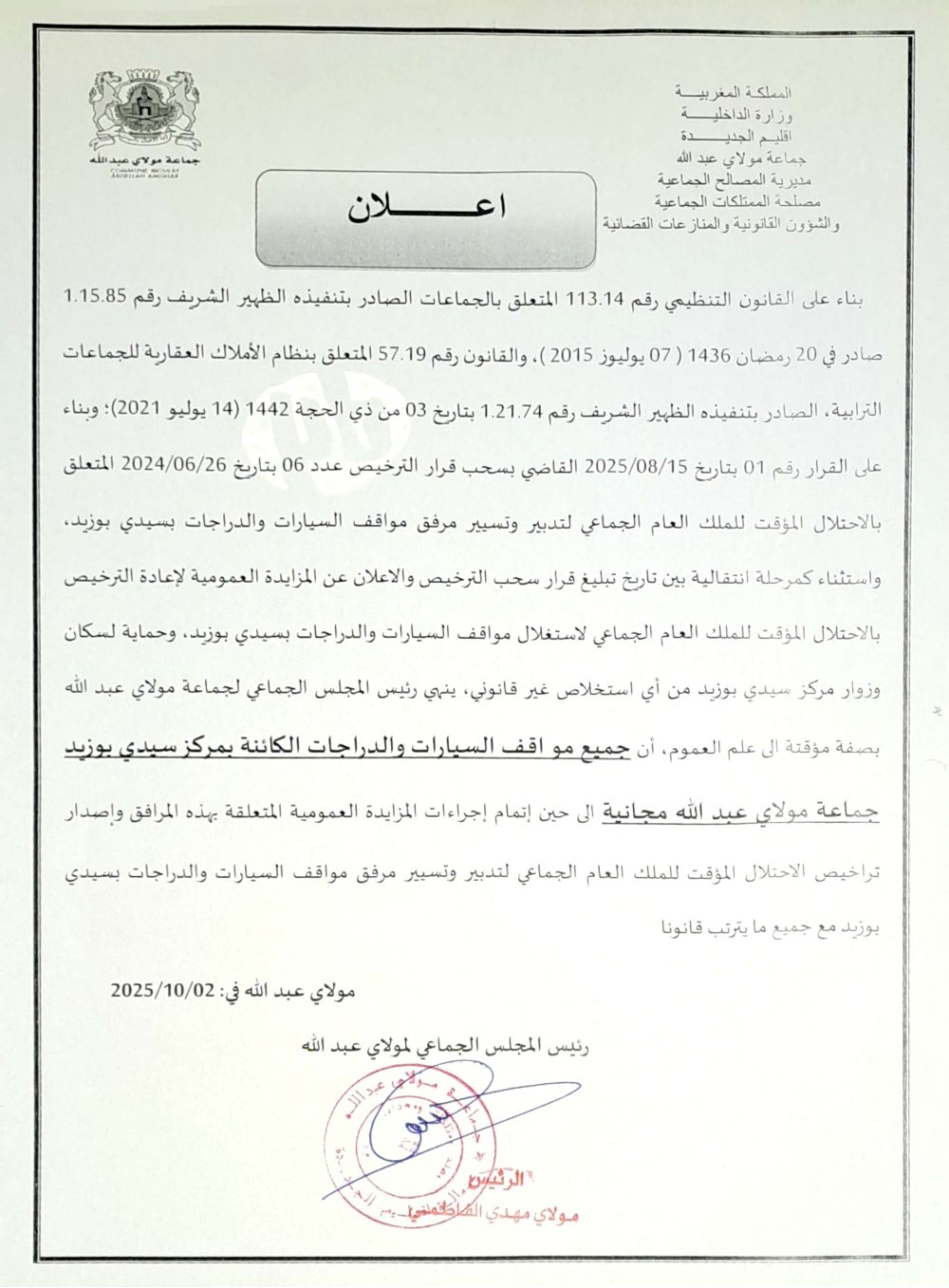 إعلان عن مجانية مواقف السيارات والدراجات بمركز سيدي بوزيد